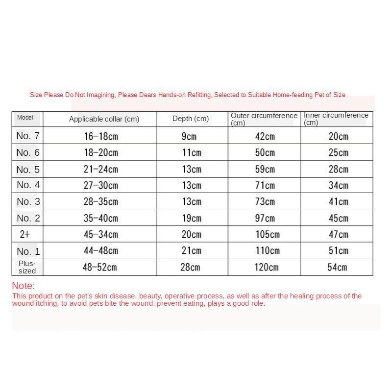 Type : Recovery SleeveOrigin : CN(Origin)Material : PlasticIs Smart Device : Nois_customized : NoType : DogsSeason : All seasonsPattern : SolidFeature : BreakawayFeature : PaddedFeature : Quick ReleaseSuitable for pets : Dog Catfeatures 1 : Pet Productsfeatures 2 : Dog protection collarfeatures 3 : Cat protection collarfeatures 4 : Elizabethan collarfeatures 5 : Convenientfeatures 6 : Beautifulfeatures 7 : Anti Bite Anti Grasping Anti Lickingfeatures 8 : anti-bite CollarSize : 9 sizesProduct DescriptionFeatures:1. The Elizabethan collar is made of environmentally friendly plastic and the all around edges is soft velvet will give them the sense of comfort. The Elizabethan collar is light, which will not make your lovable pets tired.2.The Velcro design can be adjusted according to the neck diameter of the pet to give the dog the most comfortable experience3.Translucent material, give the dog a wide field of vision, do not bind the dog4. Prevents scratching and biting at injuries, stitches, rashes, and wounds.5. Pefectly for overcoming lick-bite, itch-scratch, or use it when your pet takes a bath.It also provides a good protection in taking a bath, trimming the nails and other grooming occasions6. Multiple sizes for pets of different sizes.100% Brand new & High qualityColor: As pictureMaterial: Plastic+velvet+Velcro Note: Please allow 0.5-1 inch error due to manual measurement.Package include: Elizabethan collar* 1pc
