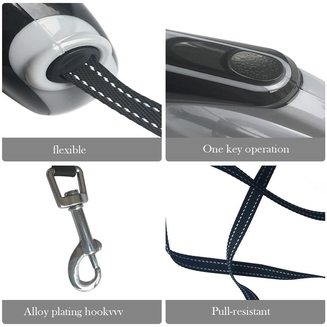 Material: ABS+NylonSize1: 3M=11.5 ft for dogs up to 55 lbsSize2: 5M=16.5 ft for dogs up to 110 lbsColor: Black /Pink/Blue/Package Includes:1 x Automatic Retractable Dog LeashFeatures:1. Perfect for small & medium & big sized dogs.2. Compact, lightweight and easy to handle. Ergonomic non-slip grip is soft and fits nicely into your hand, helping to comfortably maintain a strong grip, even with dogs that are pulling and running.